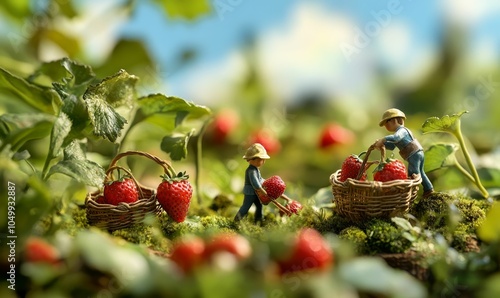 miniature, figure, people, red, green, leaf, plant, basket, wicker, garden, summer, farm, harvest, fruit, outdoors, small, tiny, cute, rural, scene, nature, idylli, whimsical, playful, mossy, field, sun, bright, moss