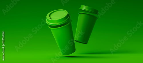 Two Minimalist Green Blank Paper Coffee Cup with open lid floating above green background. Takeaway paper coffee cup fly, 3d render illustration