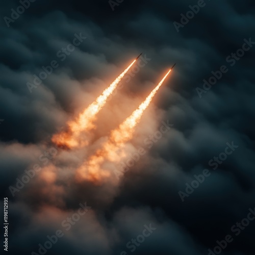 two missiles launching into the cloudy night sky