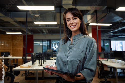 office, two people, female, businesswoman, smiling, technology, business, working, indoor, occupation, corporate culture, businessperson, woman, young adult, happiness, cheerful, confidence, success, blouse, button down shirt, shirt, earring, brown hair, holding, touch screen, office chair, desk, computer monitor, wireless technology, light fixture, window