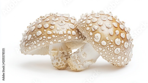 Two mushrooms are placed on a clean white surface, showcasing their natural shapes and textures in a simple yet elegant composition.