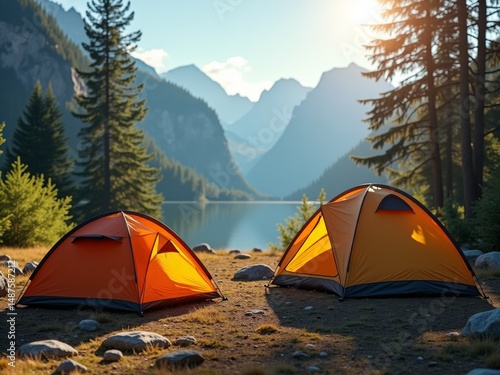Two orange tents set up in a mountainous region with pine trees and a lake at sunset