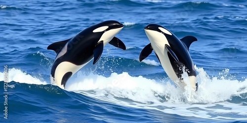 Two orcas breach, playful mid-air acrobatics amidst surging ocean waves, orcas, sea