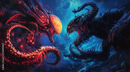 Two otherworldly creatures face off in a dramatic clash of dark and fiery hues with tentacles and sharp teeth