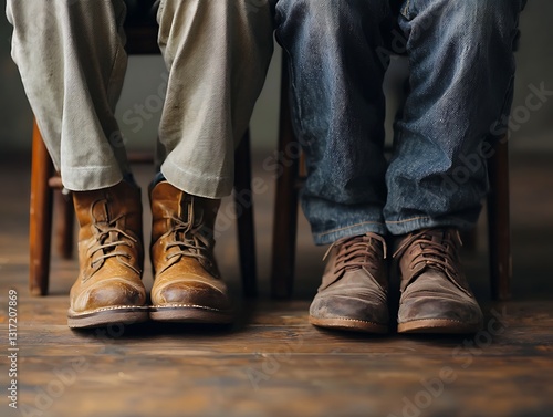 shoe, boot, footwear, comfort, worn, pattern, warmth, posture, simplicity, solitude, nostalgia, togetherness, bonding, identity, heritage, everyday, relaxation, earth, colours, floor, human, seating, companionship, fabric, emotion, rustic, appearance, craftsmanship, jean, moment, denim, vintage, story, lifestyle, leisure, style, design, fashion, texture, wood, casual attire, nature, environment, brown
