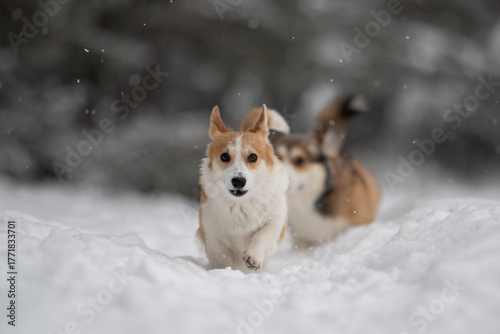 Two Pembroke Welsh Corgi dogs are seen playing outside in the fresh snow. The light brown and white corgis are running around having fun in winter weather