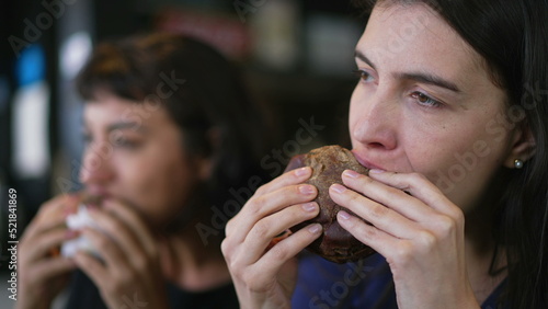 Two people eating burgers. Young women taking a bite of cheeseburgers. Female friends eating fast food lunch