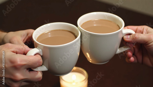 people, hand, mug, beverage, hot drink, tea, drink, ceramic, white, table, dark, cosy, intimate, candle, lit, warm, evening, relaxation, social, friendship, comfort, enjoyment, winter