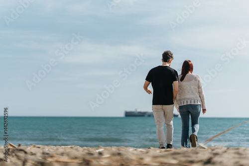 Two people share a tranquil stroll along a beach, enjoying a harmonious moment by the ocean, with a ship on the horizon under a clear blue sky.