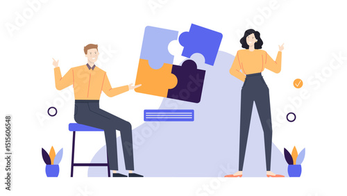 Two people solving a puzzle; suitable for teamwork, cooperation, problem solving, partnership concepts in business, education, or personal development projects.
