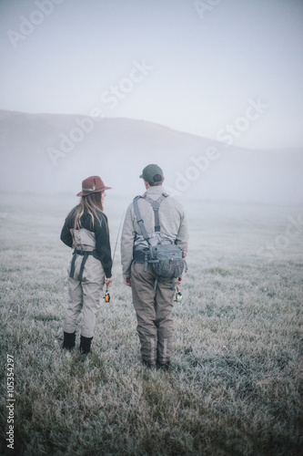 Two people walking across a meadow in early morning mist carrying fishing rods,