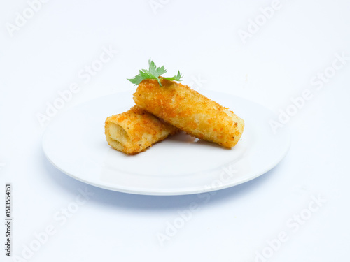 Two pieces of crispy risol mayo served on a clean white plate, isolated on a white background. Ideal for food advertising, menu design, or culinary content