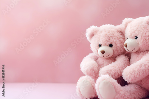 Two pink teddy bears in a sweet embrace. Plush love. Pink teddy bears hugging each other on a pink background with copy space. National hug day concept. Poster, post card, greeting card template