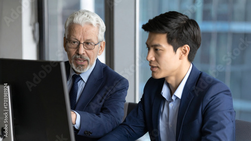 Two professional men engaged in an important discussion. A seasoned professional in glasses is offering guidance to a younger colleague while they're looking at a computer screen.