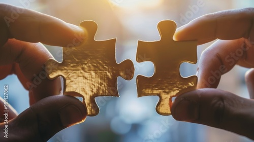 Two professionals collaborating to fit puzzle pieces together in a workplace setting