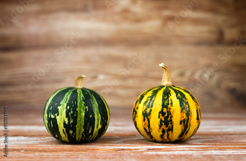 Two pumpkins on a wooden background. Close-up. Copy space.