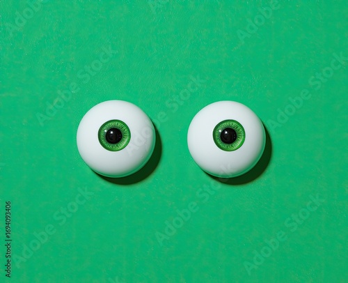 Two realistic-looking green eyes on a vibrant green surface