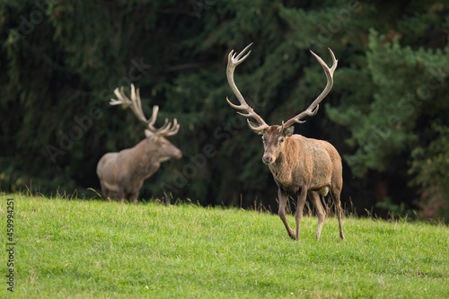 Two red deer, cervus elaphus, running on grassland in summer nature. Antlered mammals walking on green field. Stags approaching in dynamic motion on meadow.