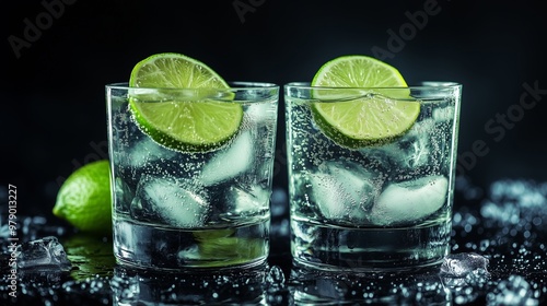 Two refreshing lime cocktails on a black background, garnished with fresh lime slices and ice.