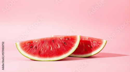 Two refreshing slices of watermelon fruit against a soft and vibrant pink background.