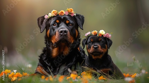 Two Rottweilers, one adult and one puppy, wearing flower crowns are sitting in a field of flowers.