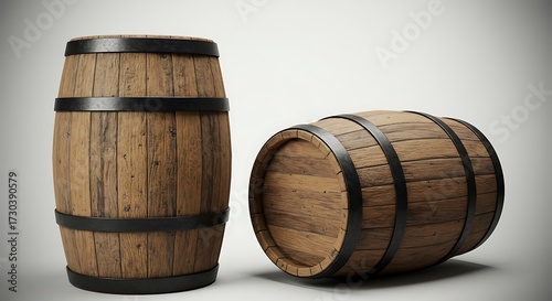Two rustic wooden barrels with dark metal rims. One is standing upright and the other is lying on its side, both against a white background.