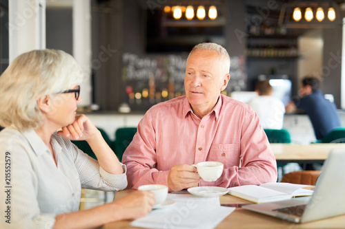 Two senior economists having tea-break in cafe and discussing some working points or ideas