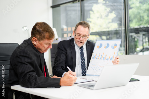 Two senior executives in suits discuss business strategy with charts, smartphone, and laptop at office desk.