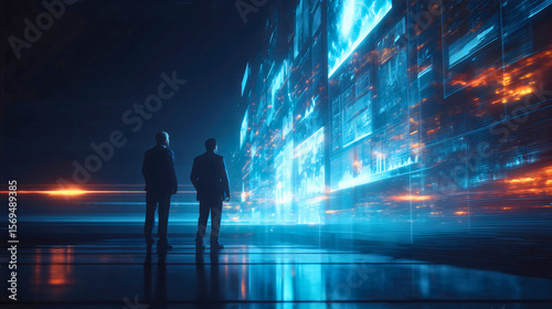 two people, man, male, looking, observing, datum, digital, technology, futuristic, holographic, display, screen, interface, cyber, network, analysis, business, corporate, innovation, science fiction, science fiction, light, blue light, glowing, dark, mysterious, abstract, concept, modern, future, back, backview, silhouette, communication, connection, programming, coding, information technology, ai, artificial intelligence, cyberspace, tech, software