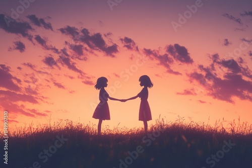 sunset, silhouette, girl, holding, hand, field, grass, sky, cloud, orange, pink, purple, twilight, evening, dusk, horizon, landscape, nature, scenery, beautiful, peaceful, serene, calm, tranquil, friendship, togetherness, bond, connection, love, affection, happy, joyful, carefree, light, shadow, colours, vibrant, warmth, summer, anime, cartoon, art, illustration, digital