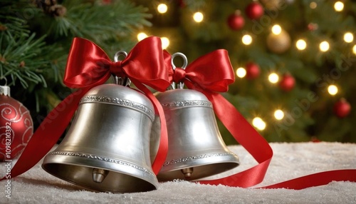 Two silver Christmas bells tied with a red ribbon, surrounded by holiday decorations and frosted pine needles.