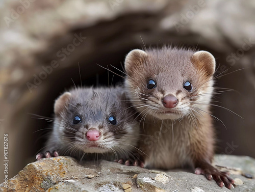 Two Small Weasels Curiously Peering From Their Burrow Near Rocky Outcrop During Daylight
