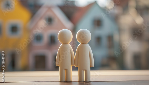 Two small wooden figurines stand together on a wooden surface, with blurred houses in the background suggesting a home, family, or new beginnings concept.