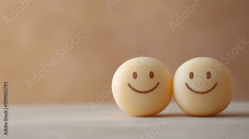 Two smiling balls on wood, neutral background, happiness concept, marketing