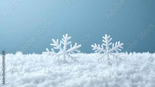 Two Snowflakes On Snowy Surface Against Light Blue Background
