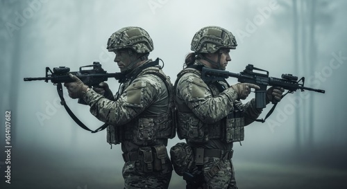 Two soldiers, a man and a woman in camouflage, hold assault rifles back to back, ready for special operations against hazy background