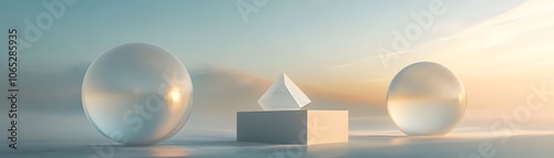 sphere, sphere, crystal, geometric, form, shape, platform, white, cube, footed, sunset, sky, cloud, horizon, evening, light, smooth, abstract, minimal, design, art, illustration, three-dimensional, rendering, digital, artwork, background, graphic, surface, composition, balance, symmetry, contrast, perspective, texture, pattern, shadow, aethereal, dreamlike, tranquil, serene, peaceful, simple