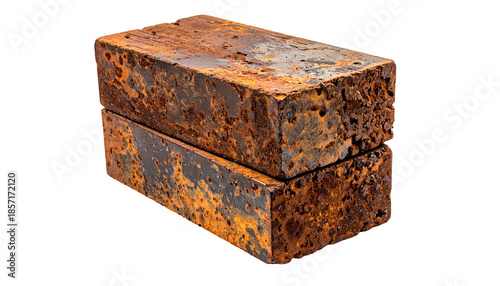 Two stacked, rectangular, heavily rusted blocks with rough texture