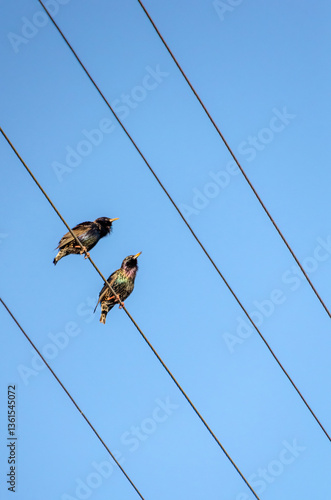 Two starlings perched on power lines against a clear blue spring sky. Birds resting, calm mood, close-up shot, slightly low angle, rural scene, contrast concept.