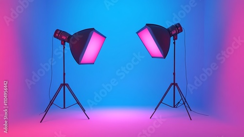 Two studio lights on tripods are set up in front of a pink and blue backdrop.