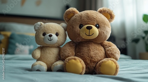 Two teddy bears on a bed, bedroom background, children's toys