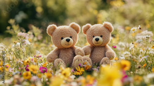 Two teddy bears sitting together in a colorful wildflower field during sunny springtime