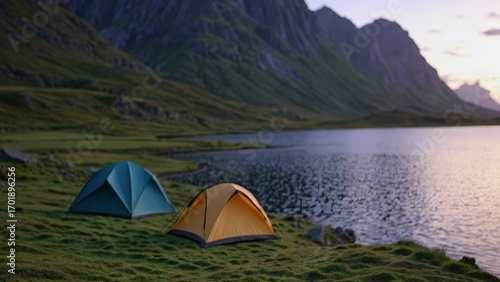 Two tents are set up on a grassy hillside. A lake and mountains with tents and camping. A peaceful evening in the wilderness with nature and nature. Two tents are pitched on a grassy slope lifestyle.
