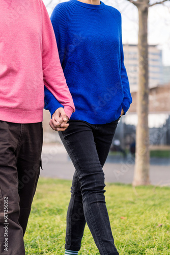 two unrecognizable people walking together holding hands in a park, concept of bonding and love, copy space for text