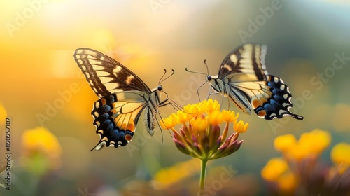 Two vibrant butterflies on a colorful flower in a sunlit garden, capturing the essence of nature and beauty.