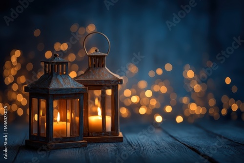 Two vintage lanterns with glowing candles sit on a wooden surface, surrounded by warm, blurred lights in a cozy, dark setting