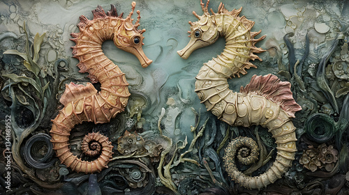 Two vividly colored seahorses, red and golden, face each other amidst swirling seaweed, creating a dramatic and enchanting underwater scene.