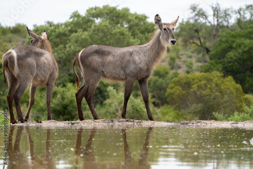 Two waterbuck female walking in front of a waterhole with beautiful reflection of their legs, Greater Kruger.