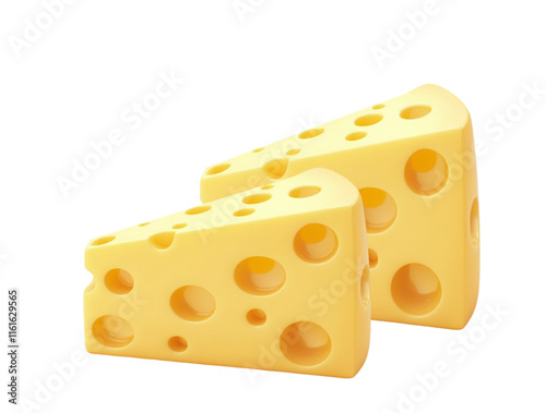 Two wedges of yellow cheese with holes placed on a white background showcasing their texture and color