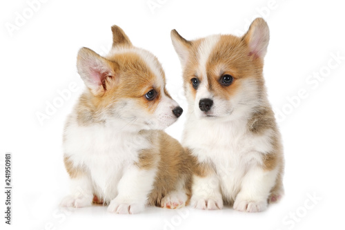 dog, pet, puppy, animal, welsh, doggy, isolate, white, breed, cute, funny, small, adorable, young, mammal, portrait, friends, fun, domestic, little, purebred, pedigreed, canino, beautiful, baby, puppy, 2, horizontal, nobody, background, studio, sitting